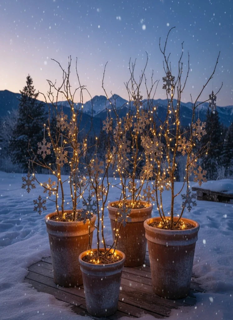 Hanging sparkling snowflakes made of cardboard and string lights will provide a lovely winter touch to your outdoor décor. When hung from tree branches, porch overhangs, or windows, these DIY light decorations give off a cosy, snowy glitter. LED string lights provide safe and energy-efficient lighting that lasts throughout the season. The subtle glow provides a magical ambiance, ideal for winter evenings, holiday parties, and festive photo backgrounds. You may also use star shapes for extra appeal and visual variation. Choose lightweight materials and cordless lighting. Browse high-quality LED string light kits and craft supplies online to create your own dazzling snowflake show that captures the essence of winter while providing warmth and beauty to your home’s exterior.