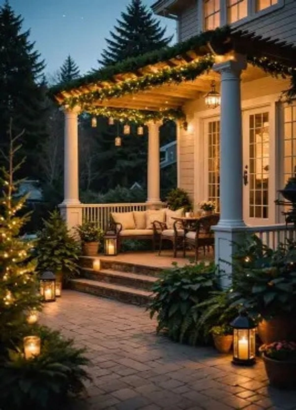 Turn your porch into a warm welcome with the elegance of Lanterns of Warm Glow. Picture yourself standing and suspending lanterns hung strategically along the entrance, each of which is filled with dainty fairy lights that gently shine against the night air. The soft golden color produces a peaceful, welcoming ambiance, ideal for warm gatherings or solitary winter evenings. Introduce a personal touch by placing multicolored ornaments or sprigs of pine within the lanterns, echoing the essence of the season. Combined with wreaths, garlands, or candles aglow nearby, these warm accents transform your porch into a cozy refuge that is as festive as it is eternal. Whether seen from the sidewalk or felt firsthand, the radiating light of the lanterns emits warmth and happiness, transforming a humble porch into a winter wonderland that embraces family, friends, and the spirit of the holidays with open arms.