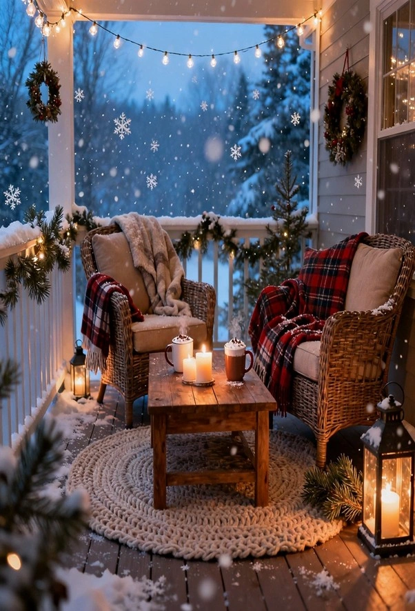 Make your porch a warm winter sanctuary with beautifully styled outdoor furniture that is both comfortable and charming. Begin with weather-resistant seating accented with plush cushions, flannel throws, and faux-fur blankets to encourage relaxation on cold nights. Include a small wooden table with candles or a tray of mugs filled with hot cocoa for a cozy welcoming touch. Strings of soft lights draped over the seating area complement the warm glow, establishing a cozy atmosphere. Complete the area with a knitted rug, lanterns, and holiday greenery such as pine sprigs or small wreaths. This arrangement combines rustic texture and celebratory warmth, making your porch the ideal haven for savoring quiet moments or sharing with loved ones on festive occasions.