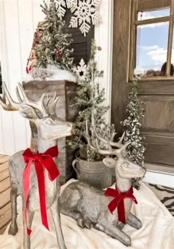 Turn your porch into a warm, rustic Reindeer Retreat for the holiday season. Employ natural wooden features, pinecones, and burlap for a real cabin-like atmosphere. Adorn with handmade reindeer statues and string soft white lights for an ambiance of soft glows. Add plaid throws and old lanterns for maximum rustic appeal. Include evergreen sprigs, little wreaths, and berries for a splash of nature’s beauty. Cover the ground or porch steps with faux snow to give a winter wonderland atmosphere. This theme is a warm, inviting space that is simple yet elegant, thus it is an excellent atmosphere for festivities or plain holiday relaxation. For family get-togethers or entertaining neighbors, this decor style brings festive spirit and cozy country charm to your porch.