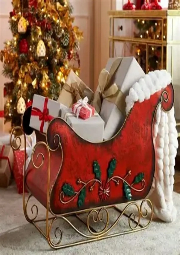 Make a delightful miniature sleigh village scene that encapsulates the enchantment of the holiday period. Placed on a snow-covered tabletop or in the yard, feature small wooden sleighs, reindeer, and Santa doll figures in a quaint village formation. Adorn the scene with small pine trees, snow-shrouded houses, and twinkle lights to provide a cozy, festive ambiance. Add details such as small lamp posts, candy canes, and presents to bring the whimsical feel. Add natural items like pinecones, berries, and artificial snow for texture and realism. This small village is a charming indoor or outdoor decoration, ideal for holiday parties or as a warm winter centerpiece. Its complex details and whimsical nature capture the fun and magic of Christmas, bringing the wonder of a holiday village to your doorstep.