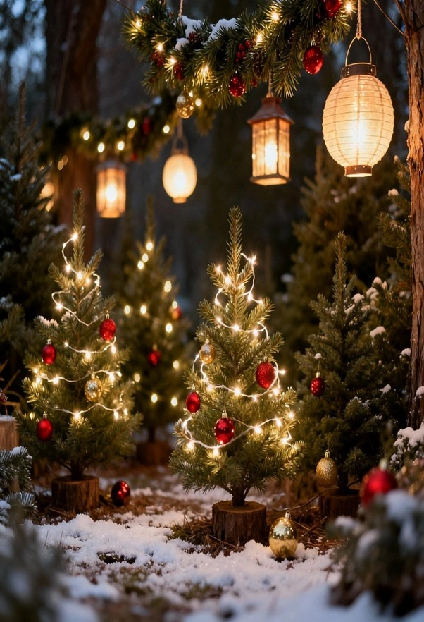 A stand of tiny evergreens produces a fascinating and peaceful holiday display that brings nature’s beauty to your doorstep. Small evergreen trees, which are frequently dressed with dainty fairy lights and small ornaments, duplicate the beauty of a forest scene. Planting them down your porch, walkway, or garden provides texture and dimension as well as recalling the fragrance of fresh pine. The mini evergreens welcome a holiday atmosphere with their bright green colors shining against winter’s calm background. Their small stature makes them a great choice for decorating modest areas while making a large seasonal statement. Whether clustered to create a miniature enchanted forest or dispersed for a playful display, this decor theme masterfully mixes simplicity and sophistication, ideal for greeting visitors warmly and in style during the holidays.
