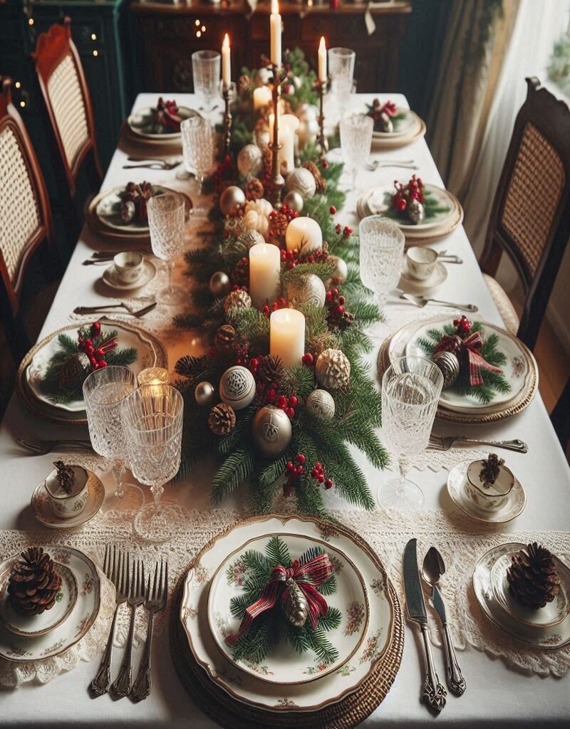 Set the mood for a warm and nostalgic holiday with a vintage Christmas table setting. Bring in an old-world charm with antique-style plates, cutlery, and glassware in deep reds, greens, and the traditional Christmas colors. Add nostalgic decorations, including miniature sledges, vintage ornaments, and lace doilies that provide delicate textures and remind one of holidays past. Add candlelight in vintage holders, along with soft, warm lighting, to make your setting inviting and cozy. This theme celebrates timeless elegance combined with a sentimental touch and is perfect for family gatherings or those who cherish tradition. Mixing classic holiday hues with vintage décor elements will make your Christmas table comforting and full of festive spirit, impressing your guests and making for a charming holiday experience that can be both magical and heartfelt.